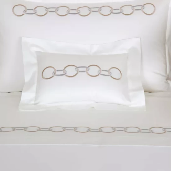 - Cotton sateen with satin-stitch scroll embroidery