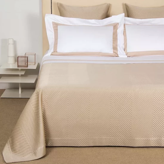 Yarn-dyed jacquard fabric woven on a silk organdy warp is defined by a subtle yet graphic chevron motif that highlights the glossy look of Frette’s Herringbone Lux bedding collection.