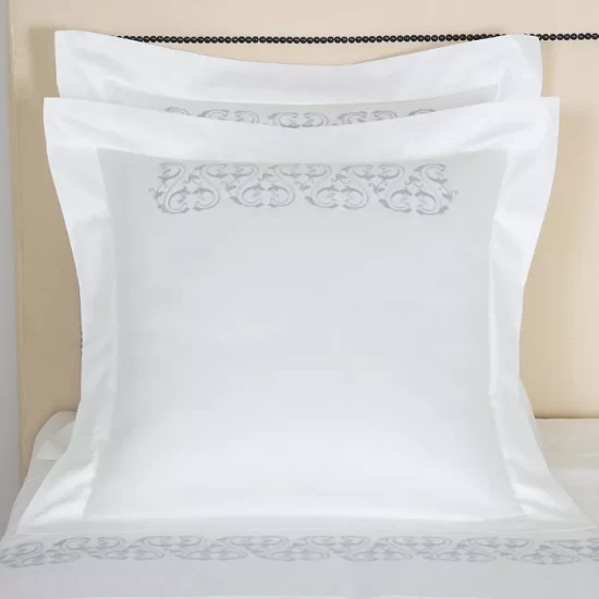 - An arabesque scroll adorns extra-long staple cotton sateen in this new iconic embroidered bedding
